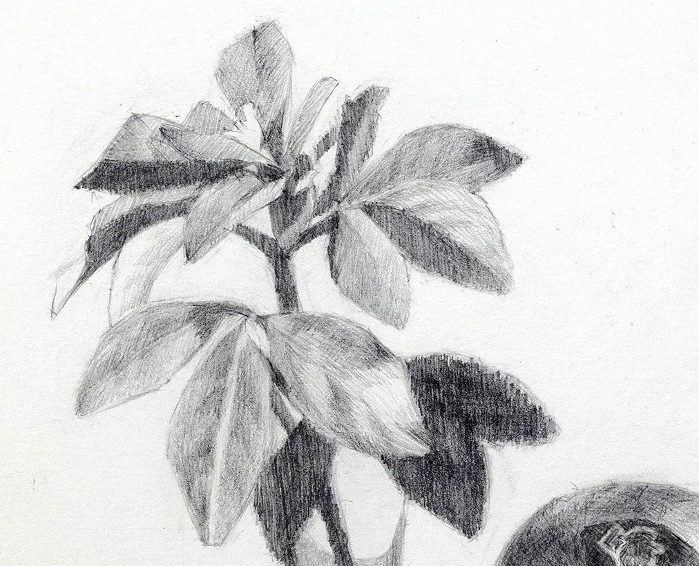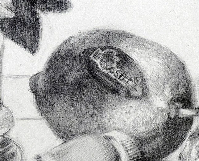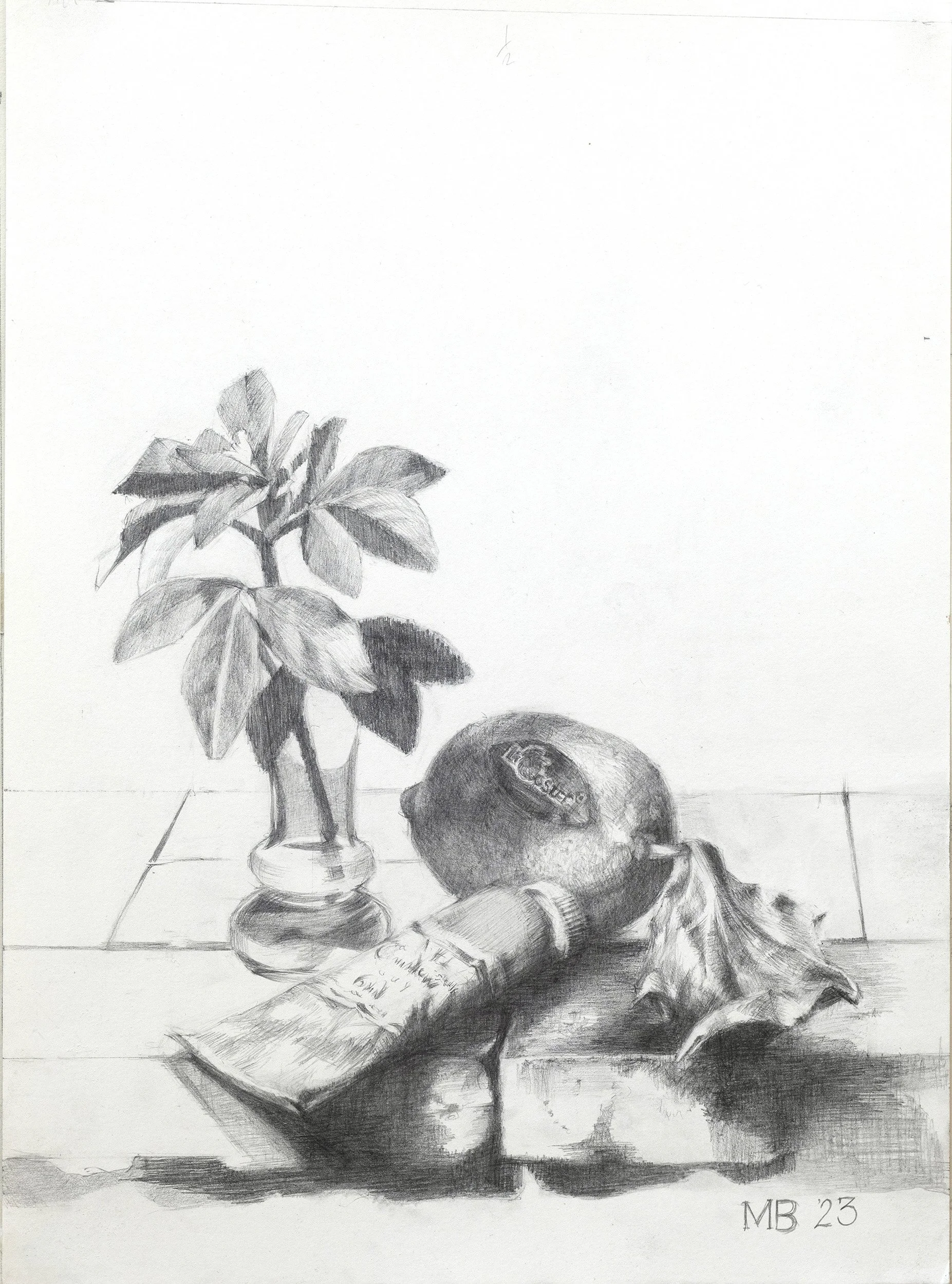 Second drawing in the Collection of Paint Tubes. Each drawing is made to ‘check’ the composition and get to know it before I embark on a painting. I found this rather large lemon at Christmas time and even though the leaf is dry it stayed in place and seemed to belong there. The drawing is simply framed in a deep grey moulding and certainly holds its own as a compelling art work to bring an extra style to your interior.